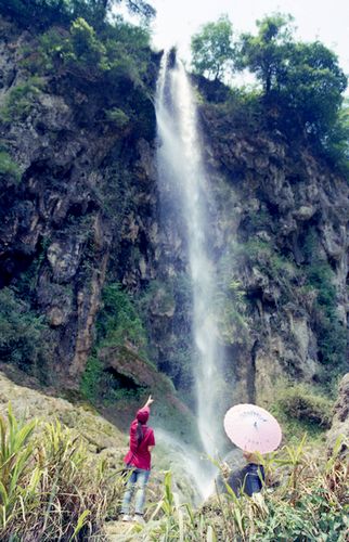 滴水崖,系溶岩断层所致,长约300多米,高约30米,崖顶平坦,面积20余亩。崖间,绿树丛生,藤牵蔓绕,怪石嶙峋,危岩欲坠。崖底右上方有一石洞,洞口狭窄,仅容一人进出,洞体斗折而上,到三米高处,渐宽至七、八米,洞深约21余米,洞内宛延曲折如入迷宫。置身崖下,一泓清泉从30米高崖顶飞泻而下,訇然有声。水花溅处,喷珠吐玉,细雨霏霏,如雾似烟,宛若一条条随风摆动的轻纱,在阳光照耀下,又如一道道若隐若现的彩虹。雨丝飘处,沁人心脾的凉意使人顿感轻松惬意。随着季节的更替,滴水崖的泉水也变幻着各种形状。春日,喷珠泻玉,熠熠生辉;盛夏,瀑布飞垂,气势磅礴;金秋,涓涓细流,朝夕潺潺;隆冬,冰棱悬垂,晶莹剔透。远远望去,滴水崖仿佛是一幅变幻万千、四季景异的巨大天然壁画悬挂在天地之间。当地村民自觉保护好这一自然景观,该景点已纳入当地社会发展总体规划,越来越多的游客慕名而来,亲身体验“飞流直下三千尺,疑是银河落九天”的意境。